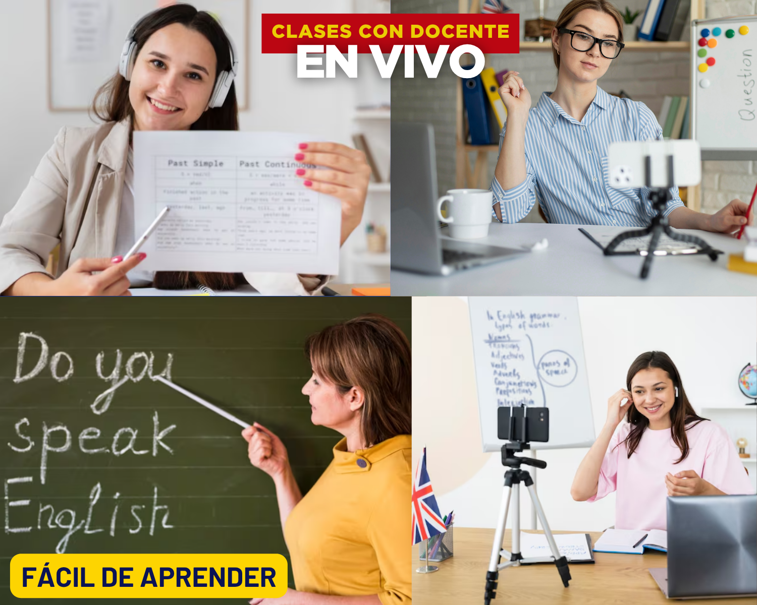 No, nuestras clases NO son grabaciones, son clases con docente en vivo y en directo, que explica e interactúa con nuestros estudiantes, responde preguntas, da recomendaciones y tips de aprendizaje, todo en vivo y en directo desde tu hogar, ahorrándote dinero y tiempo en transporte.